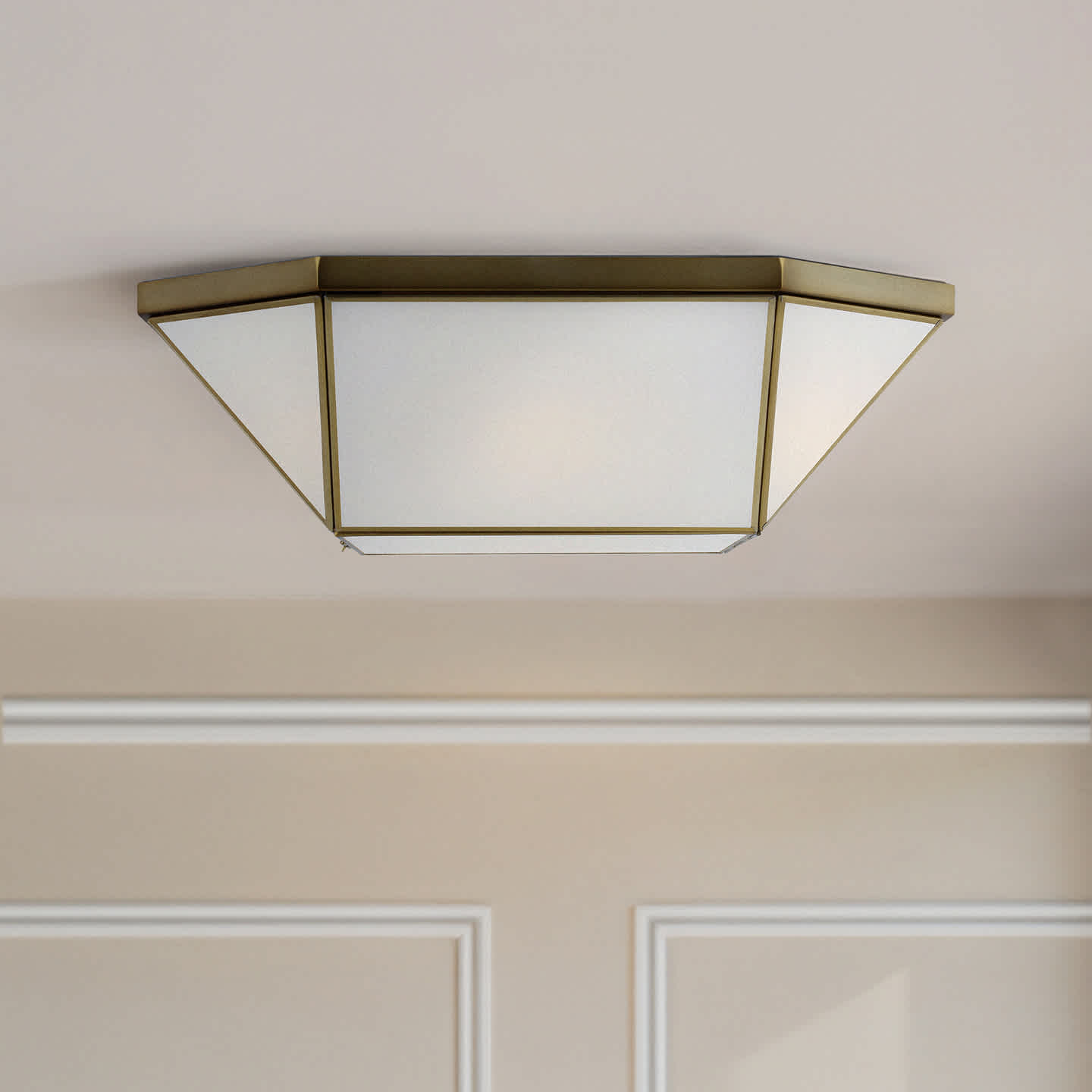The geometric steel flush mount is a modern take on a 3-dimensional silhouette balancing soft lines with strong geometry. The windowpane design keeps the look light and airy, making it an understated statement in entryways, powder rooms, and hallways.