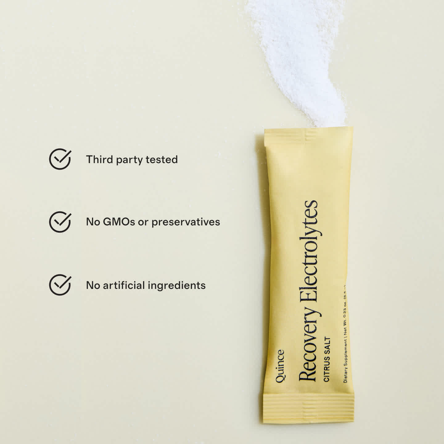 Recovery Electrolytes provides rapid, lasting hydration to help you prepare for, perform during, and recover from exercise. Our formula has a potent blend of four essential minerals to help maintain optimal hydration, prevent muscle cramps, and aid in recovery, with no sugar or artificial ingredients to slow you down.
