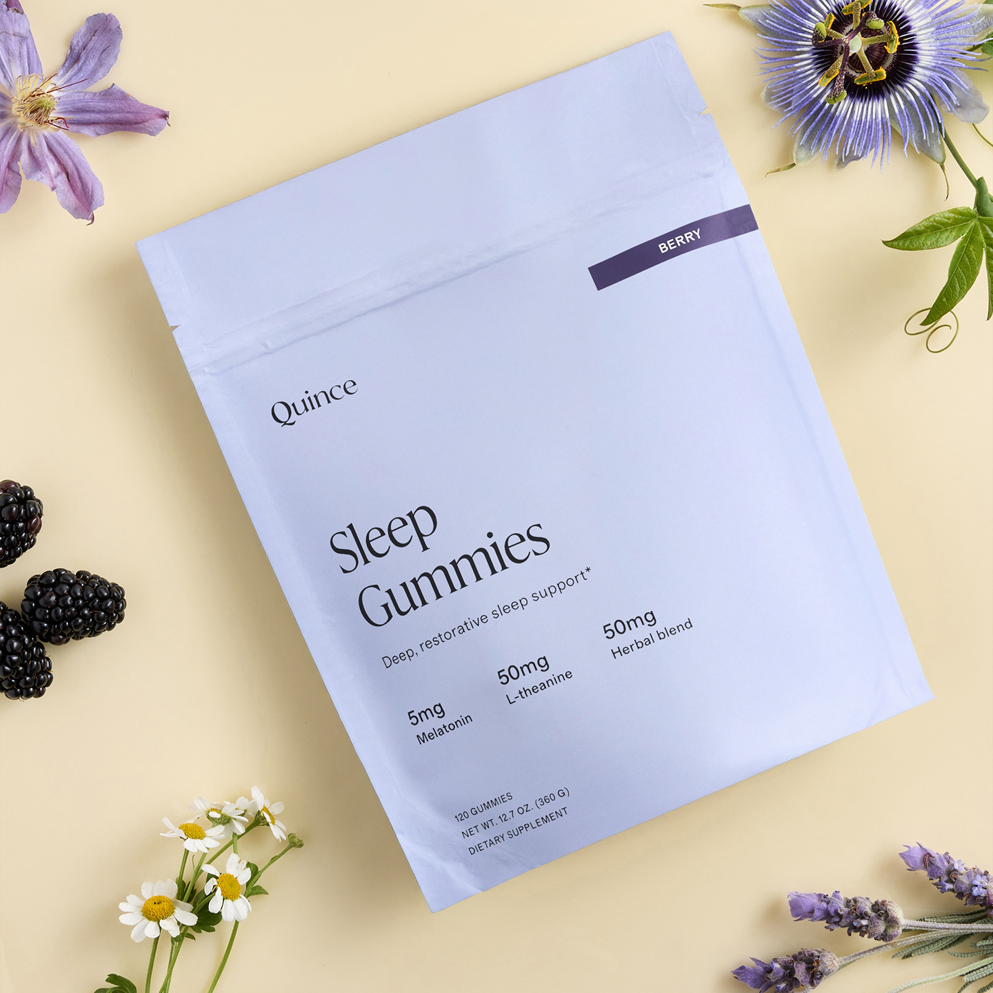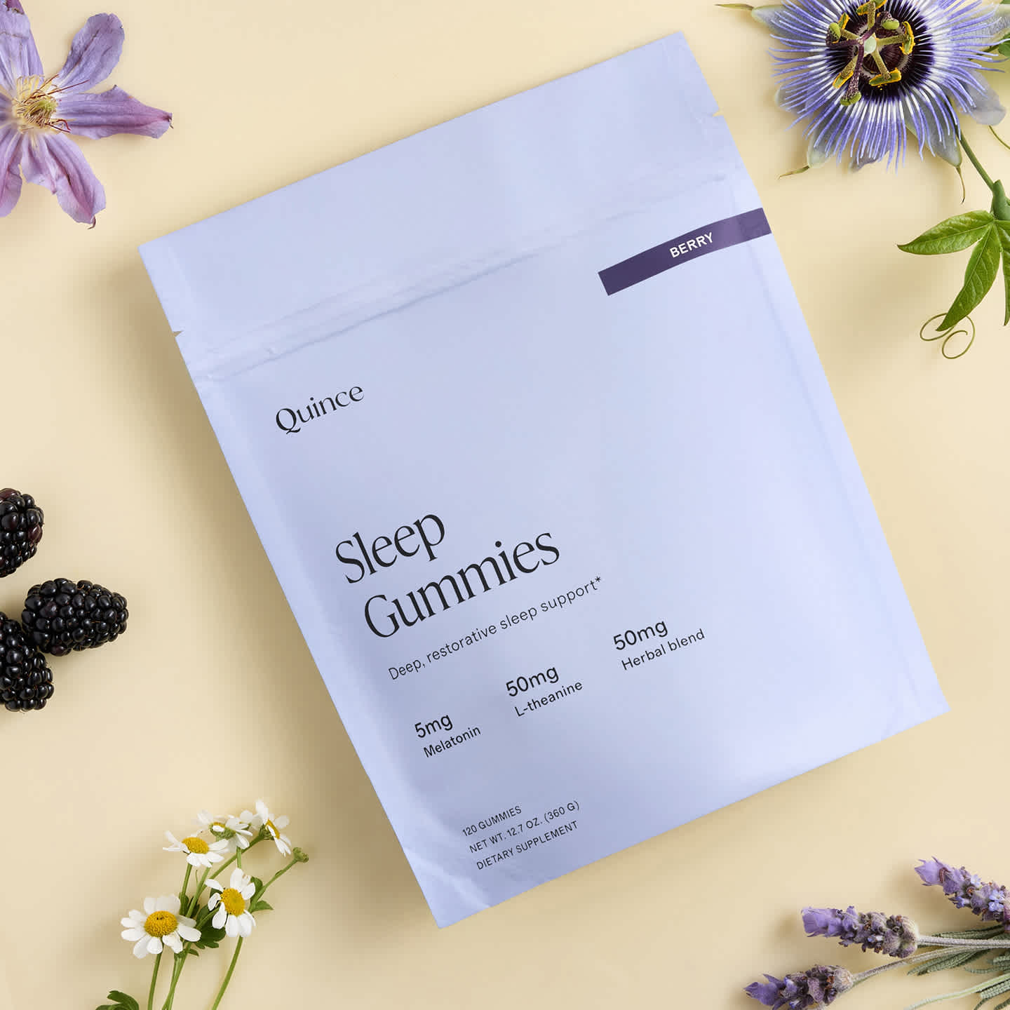 - 5mg plant-based melatonin, 50mg L-theanine, and 50mg organic herbal blend per two-gummy serving