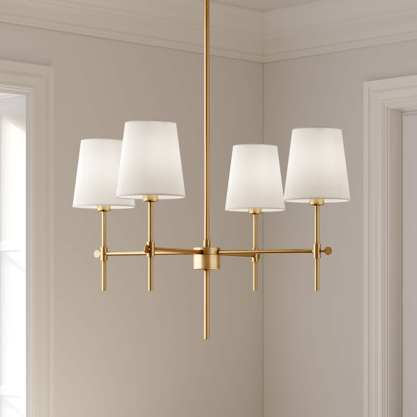 Clean lines meet soft texture in this refined linear steel chandelier. Four white linen shades cast a warm, even glow, while the sleek silhouette adds understated sophistication. Available in warm brass or black, it’s designed to be a timeless focal point in dining rooms, kitchens, or open living spaces.