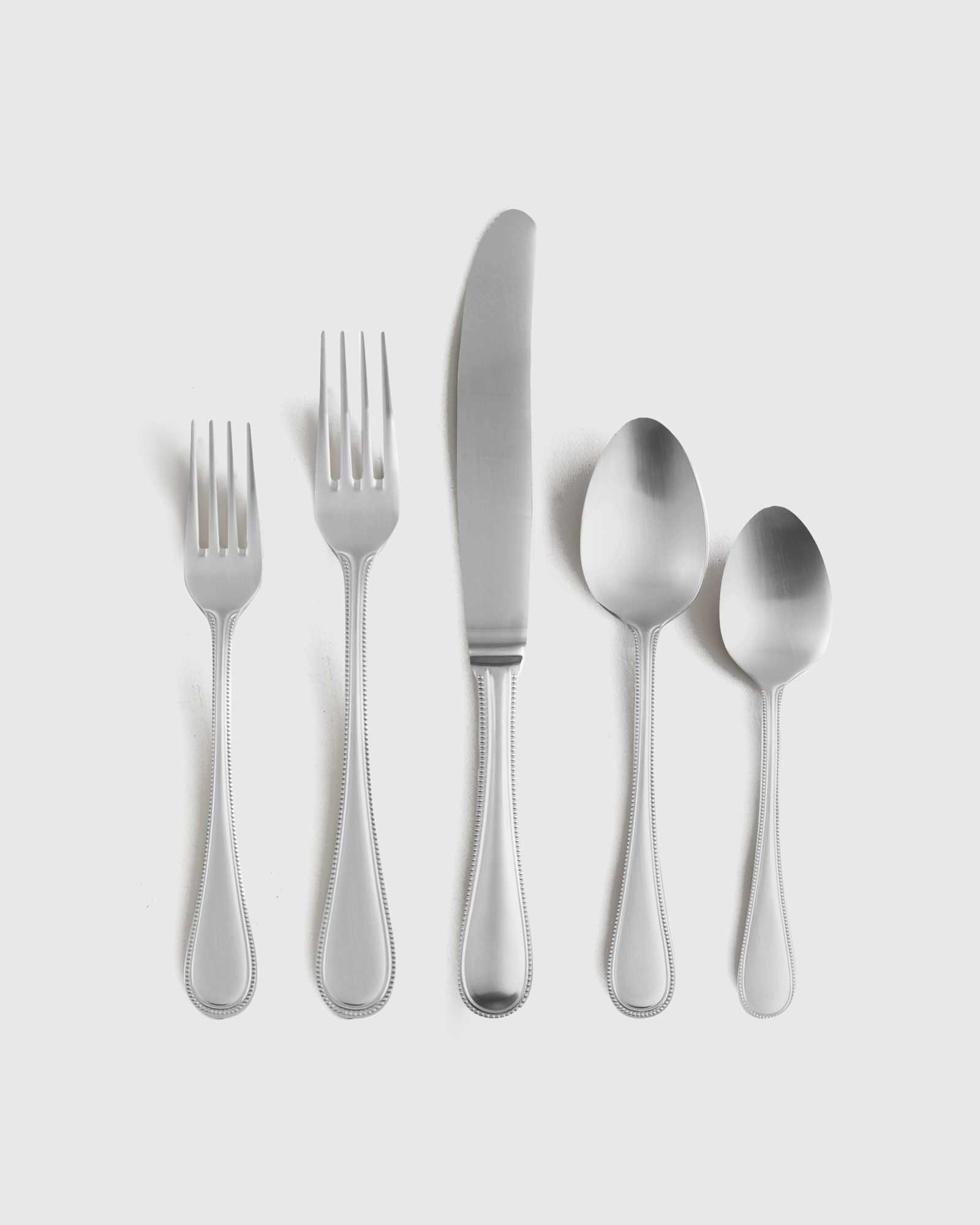 - 20-Piece Set includes (4) salad forks, (4) dinner forks, (4) double-serrated dinner knives, (4) dinner spoons, and (4) teaspoons
