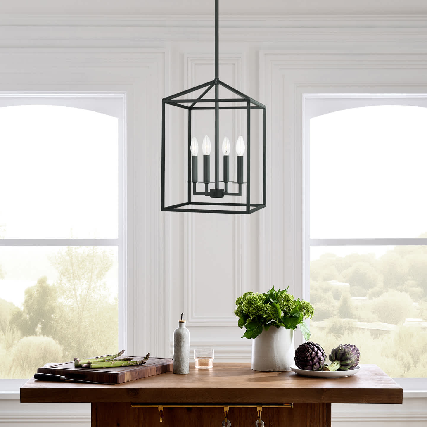 Pendants should hang approximately 30-32" above the surface of the island from the bottom of the fixture. For multiples, allow at least 24" between each pendant and 10-12" from edge of the island.
